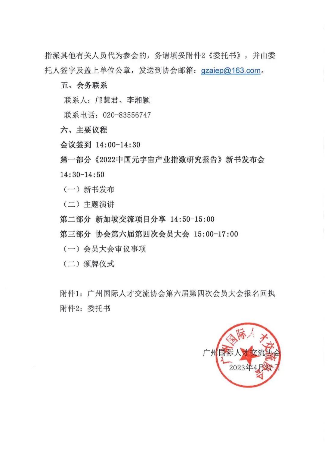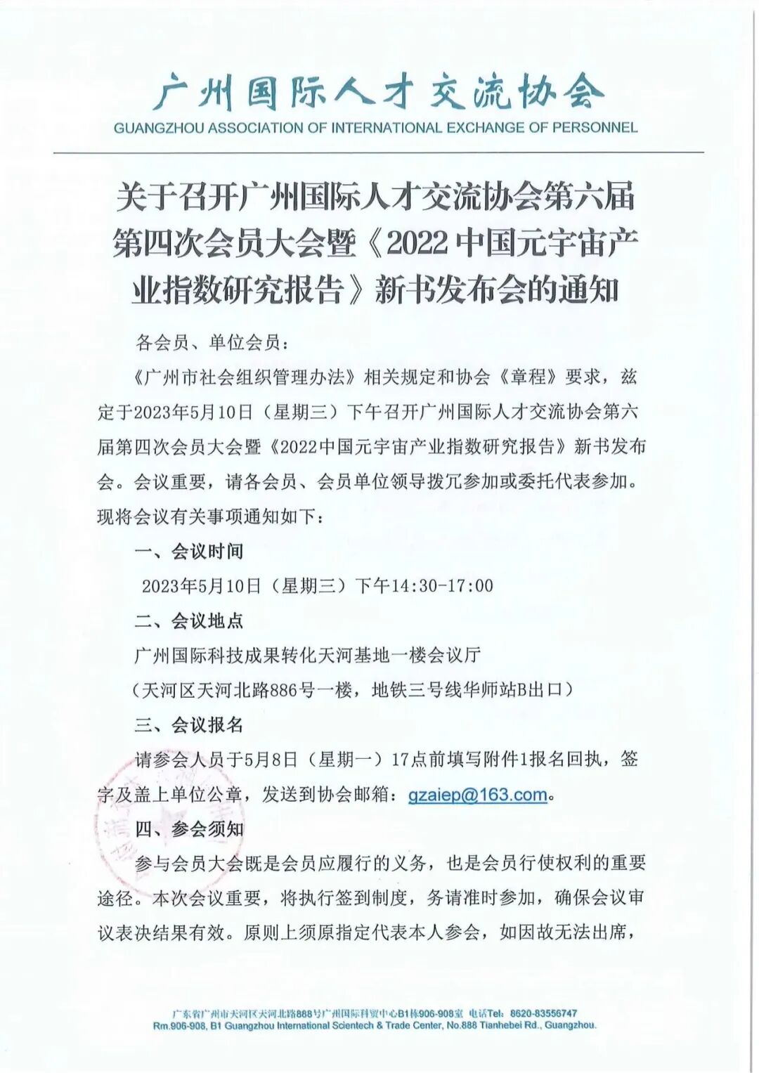 《广州市社会组织管理办法》相关规定和协会《章程》要求,兹定于2023年5月10日(星期三)下午召开广州国际人才交流协会第六届第四次会员大会暨《2022中国元宇宙产业指数研究报告》新书发布会。会议重要,请各会员、会员单位领导拨冗参加或委托代表参加。现将会议有关事项通知如下: